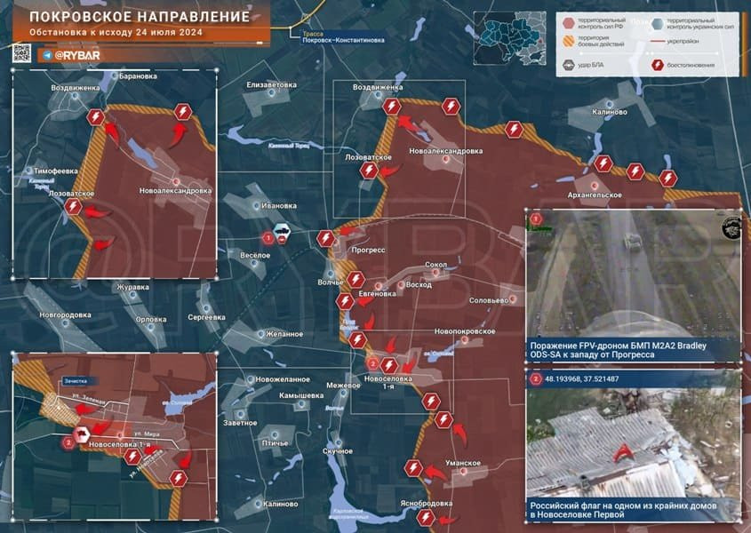 На Авдеевском направлении российские войска водрузили флаг на западной окраине в Новоселовке Первой. К западу от Прогресса дронами поражен очередной M2A2 Bradley ВСУ.