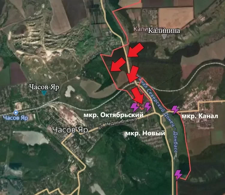 На Константиновском направлении после прорыва ВС РФ на западный берег канала “Северский Донец - Донбасс” положение дел покрыто туманом войны. Тем не менее, появилась обновлённая информация о месте прорыва и занятых нашими бойцами территориях. Прорыв произошёл в зоне между Калинина (Калиновкой) и микрорайоном Октябрьский . После прорыва наши бойцы ворвались в микрорайон Октябрьский в Часов Яре и заняли там восточную часть. Сейчас в городе идут ожесточённые бои за контроль над территорией. Нахождение подразделений Армии России в микрорайоне Новый пока что не подтверждается.