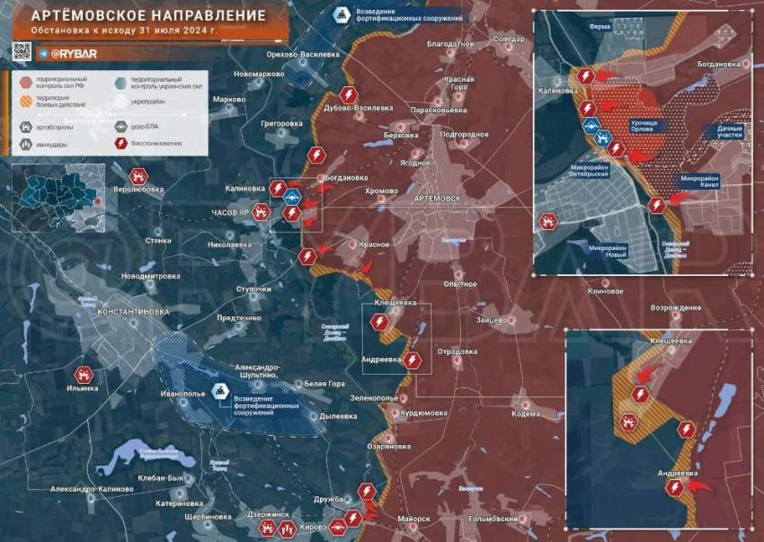На Александро-Калиновском направлении российские войска расширяют зону контроля в районе Кирово и Артемово, приближаясь к административным границам Дзержинска, сообщает Telegram-канал "Рыбарь".