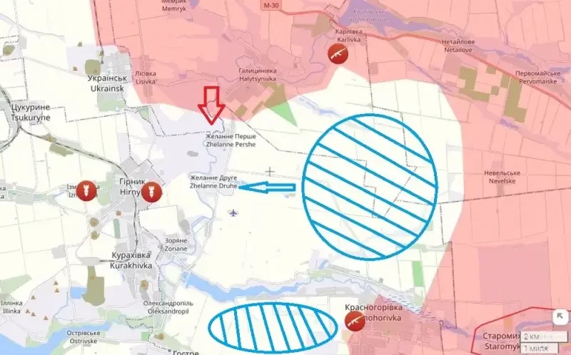 Накануне штурмовые подразделения ВС РФ, после взятия Карловки, опрокинув выставленные заслоны, на плечах отступающих формирований ВСУ вошли в село Галицыновку, после чего оперативно переправились через реку Волчья и устремились к поселку Желанное Первое. Подобное развитие событий прогнозировалось нами до этого, поэтому нет сомнений, что штурмовые группы россиян будут стремиться выйти в район Горняка, Зоряного и Курахивки.