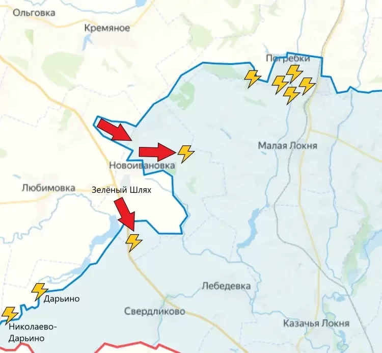 Выше по линии соприкосновения, в Новоивановке, Зеленом Шляхе, Леонидово наши части каждый день отражают атаки ВСУ. Возле Малой Локни противник тоже контратаковал, задействовал бронетехнику, но успеха не достиг, наши рубежи удержали. В Погребках без изменений и пока некоторая пауза: ВСУ прекратили попытки отбросить наши силы от села.