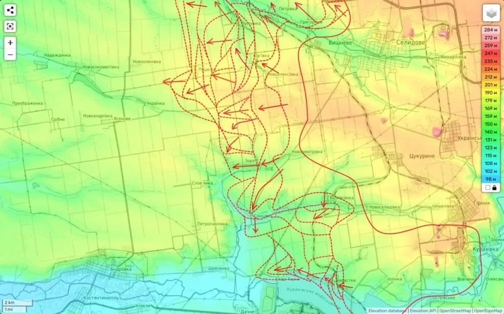 Чуть южнее и одновременно западнее Селидово, в районе Пушкино, также есть небольшие успехи по направлению к н.п. Украинка.