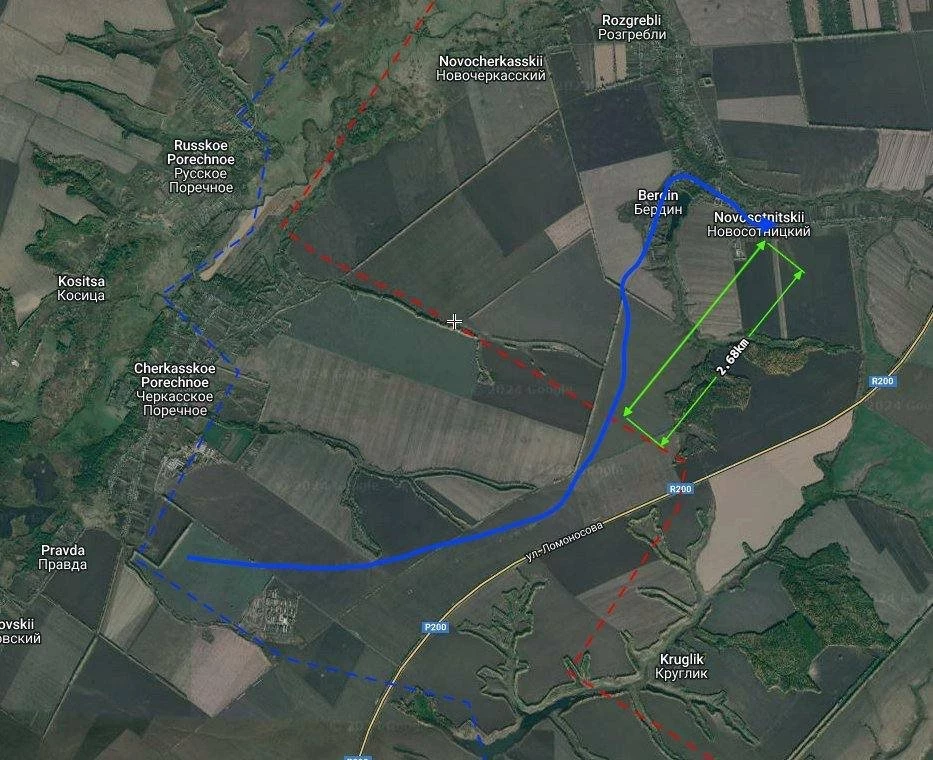 Вчерашняя неудачная попытка наступления ВСУ пока не получила никакого продолжения, хотя в районе Суджи, откуда ВСУ выдвигались вчера, есть движение вражеских сил. По данным американского Института изучения войны (которые далеко не всегда отражают реальность), украинские военные зашли в южную часть Бердина и дошли до дороги, которая соединяет его с Новосотницким. По подсчётам аналитиков, ВСУ смогли пройти примерно на 2,7 км вглубь территории России. Однако судя по данным с мест, закрепиться там они не смогли.